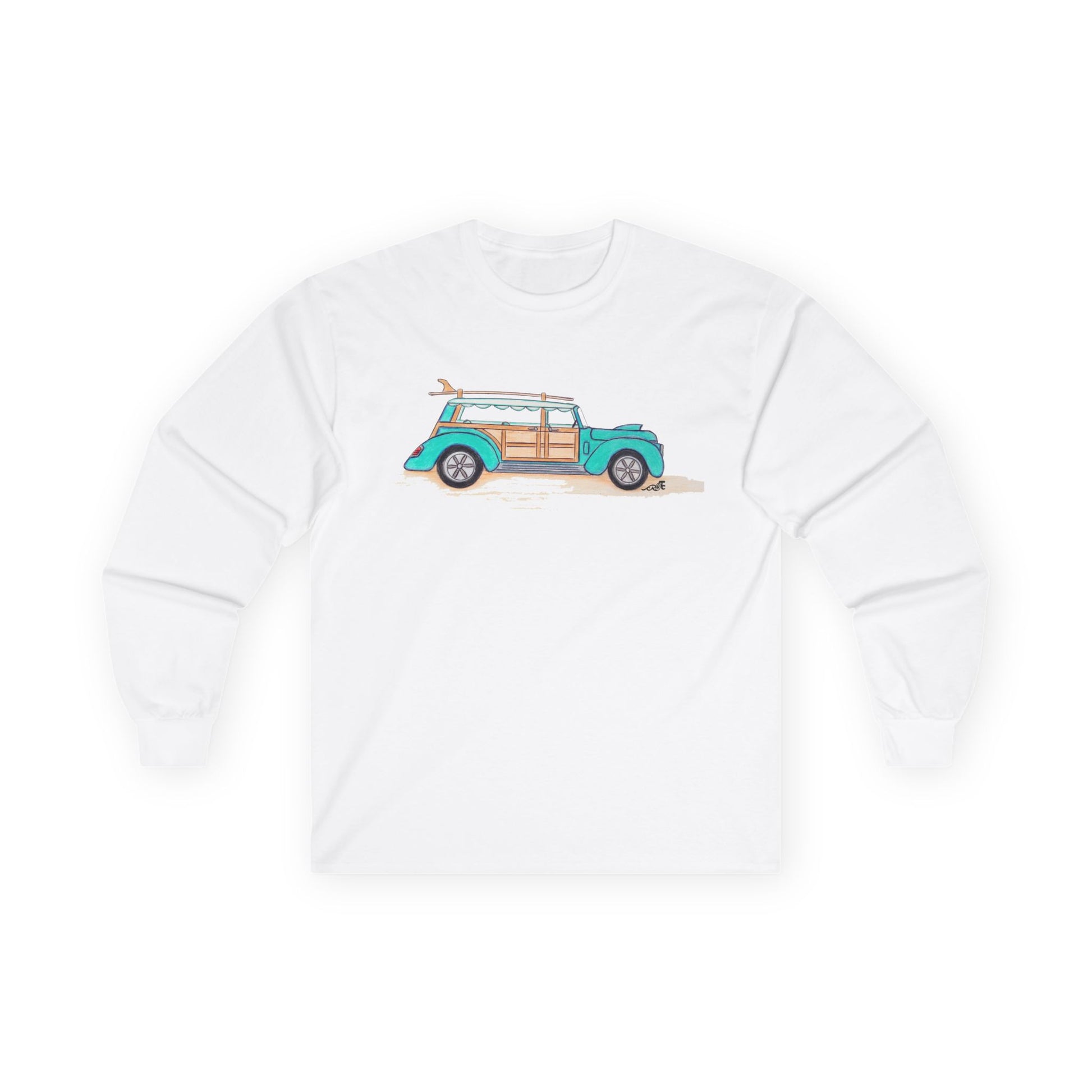 Catch waves and good vibes in the Boardwalk Cruiser Softstyle Long Sleeve Tee — your go-to for coastal chill and vintage cool. Featuring a hand-drawn turquoise woodie wagon with a surfboard on top and retro beach-day details, this shirt celebrates endless summers, sandy roads, and the freedom of the open shoreline.