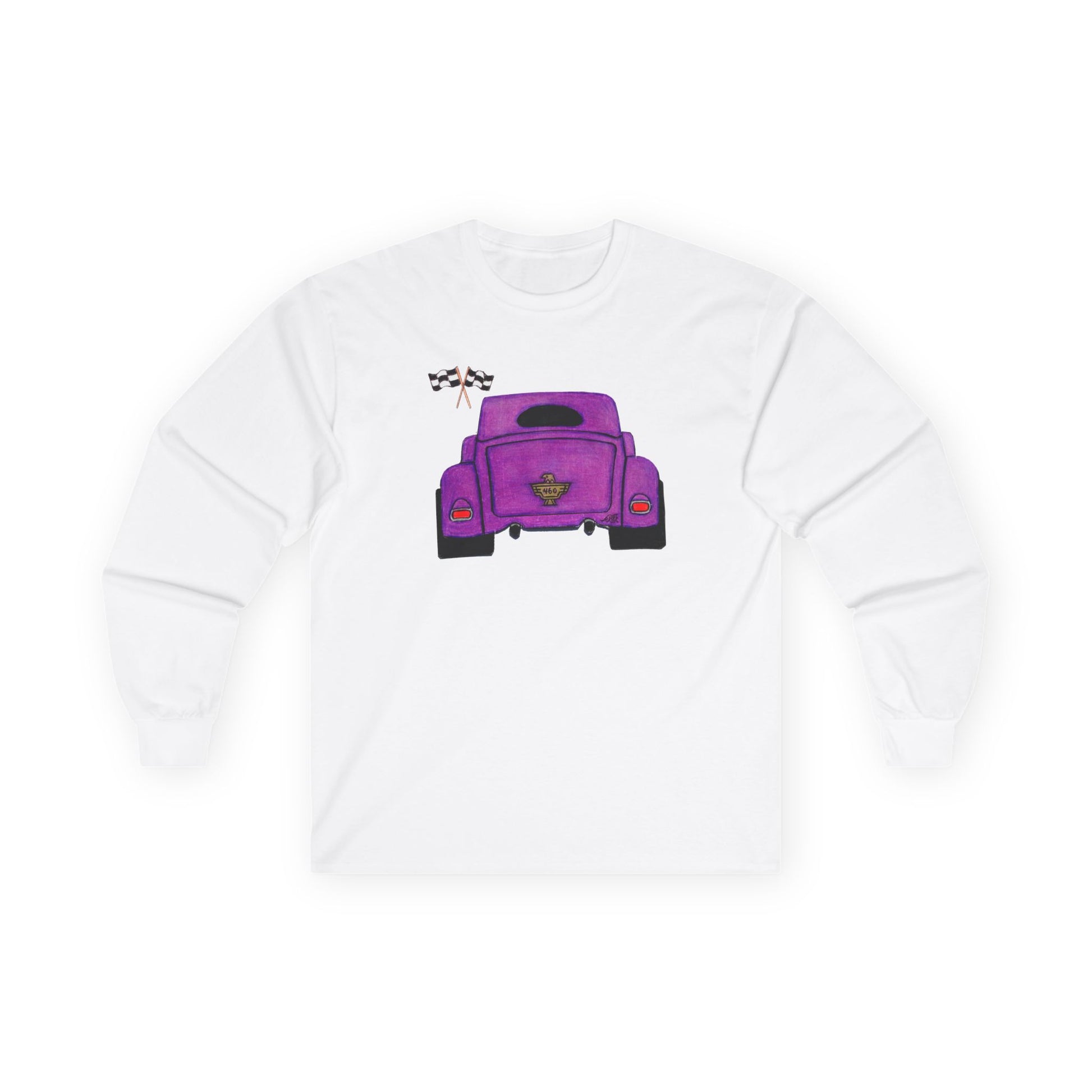 Loud in color. Loud in power. The Purple Falcon Softstyle Long Sleeve Tee captures the bold attitude of a custom cruiser packing a 460 under the deck and a golden falcon badge to match. This rear-view sketch puts the focus on what matters—raw muscle, clean lines, and a paint job that demands attention.