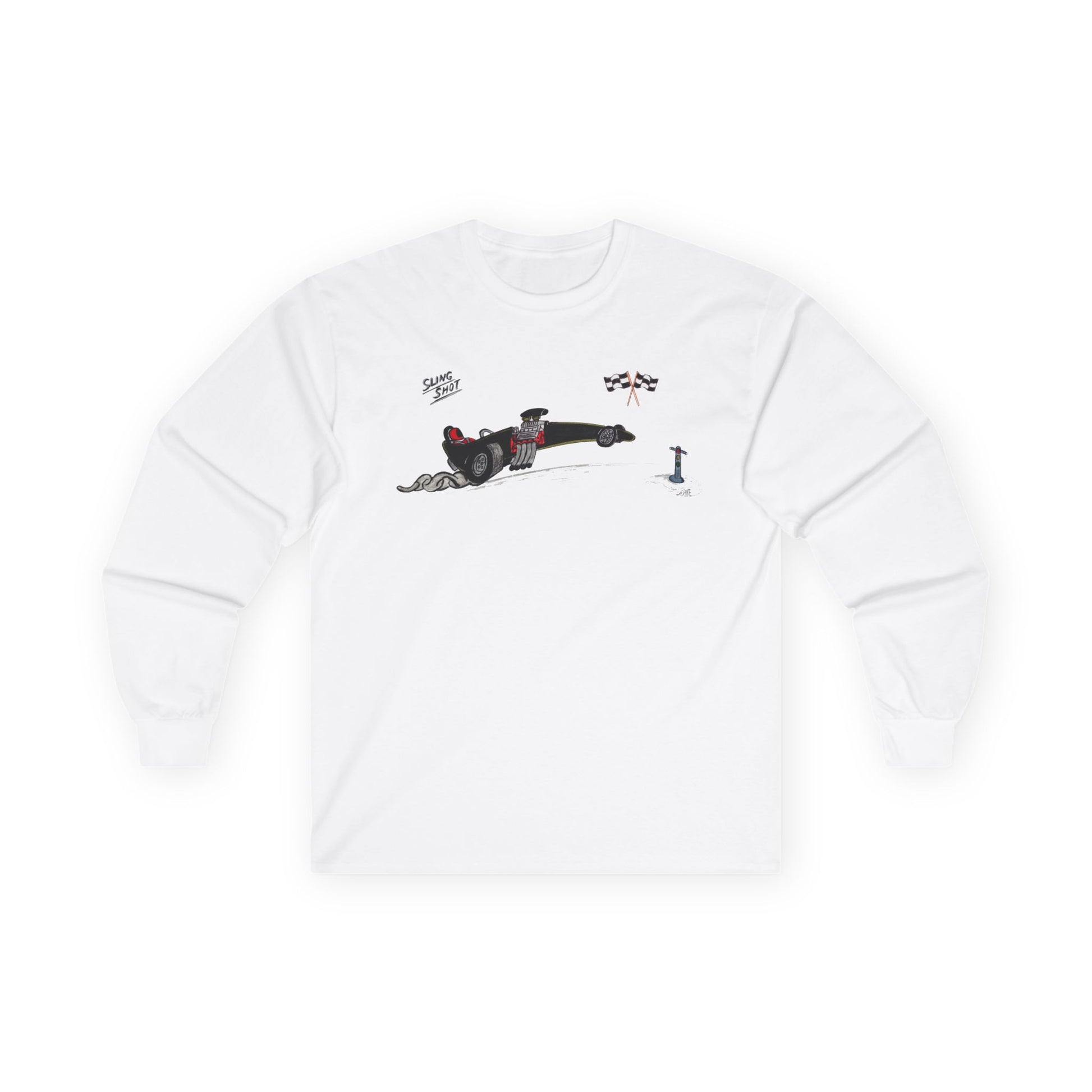 Fire it up, light the tires, and launch hard—Sling Shot Softstyle Long Sleeve Tee is built for straight-line speed and nothing else. Featuring a hand-drawn rail dragster mid-burnout with its front wheels lifted and its blower screaming, this tee captures that split-second moment when everything hits green and the car becomes pure motion.